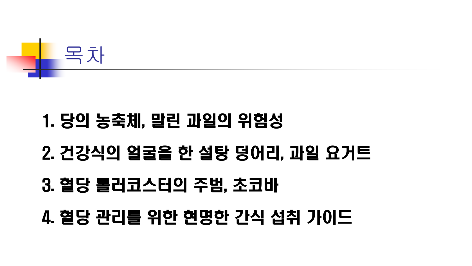 • 설탕을 직접 뿌려 먹는 것보다 혈당 상승 속도가 더 빠르게 나타나는 경우가 빈번한 이유가 바로 이 '당 밀도'에 있습니다.