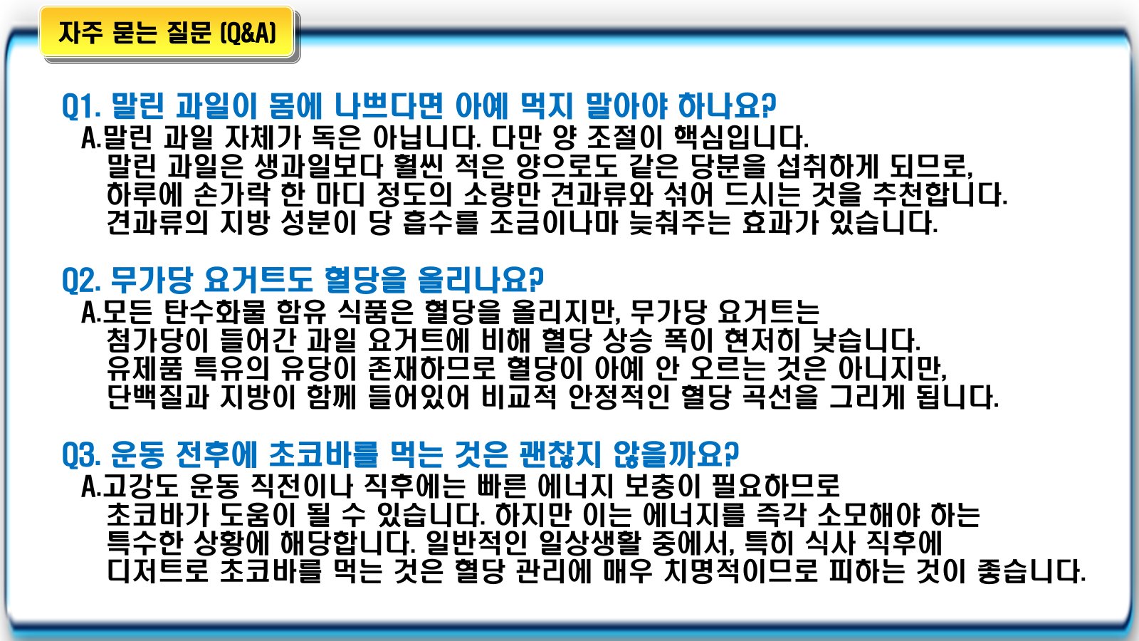 • 특히 식사 직후에 과일 요거트를 먹는 습관은 이미 올라가 있는 혈당 수치에 '기름을 붓는 격'이 되어 혈당 스파이크의 주된 원인이 될 수 있어요.