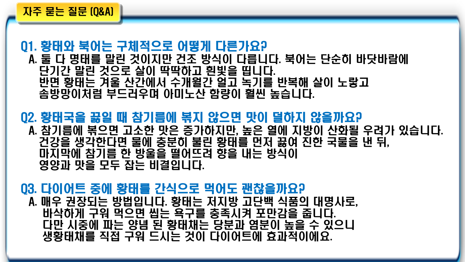 - 따라서 사계절 내내 유통되는 일반 건조 제품보다 겨울철에 정성껏 말린 황태가 기력 회복과 체력 보강에 훨씬 큰 도움을 줄 수 있습니다.