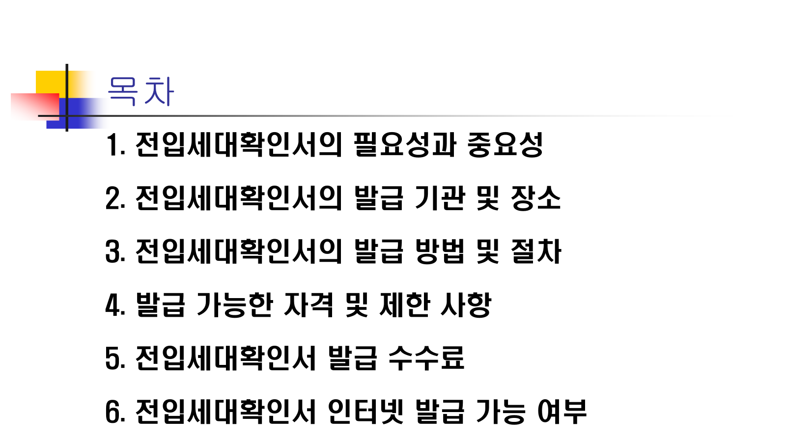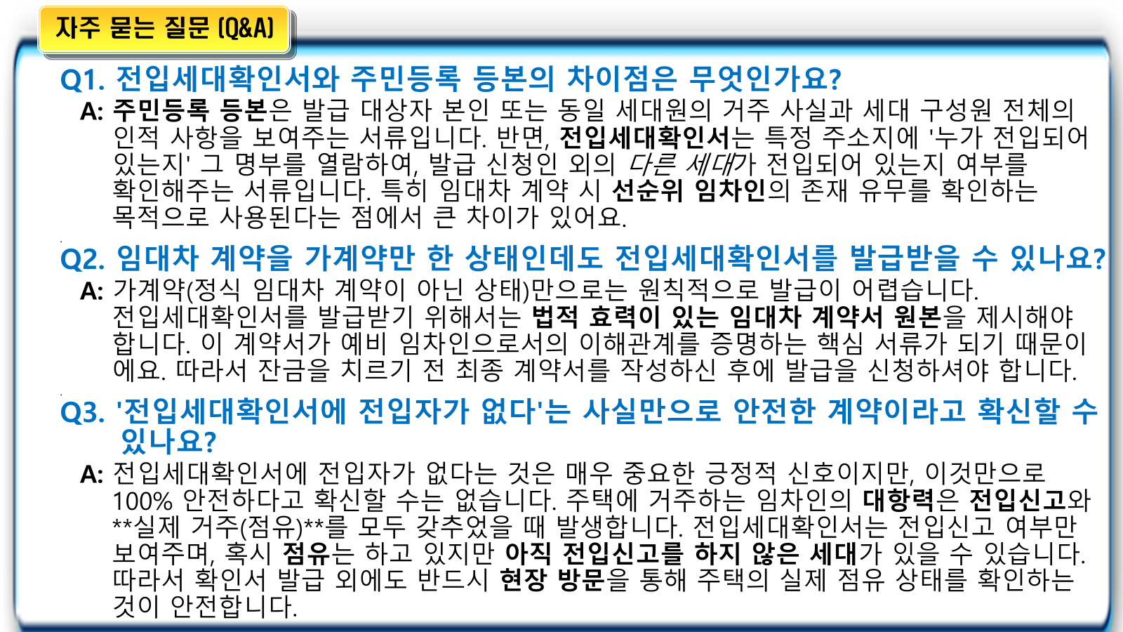 • 필요성: 매매 계약 시에도 매수자는 해당 부동산에 거주하는 세대가 매도인 외에 다른 전입세대가 있는지 확인해야 합니다. 만약 다른 임차인이 있다면, 매수인은 그 임차인의 임대차 계약을 승계하게 되므로, 계약 전에 이 내용을 정확히 파악해야 합니다.