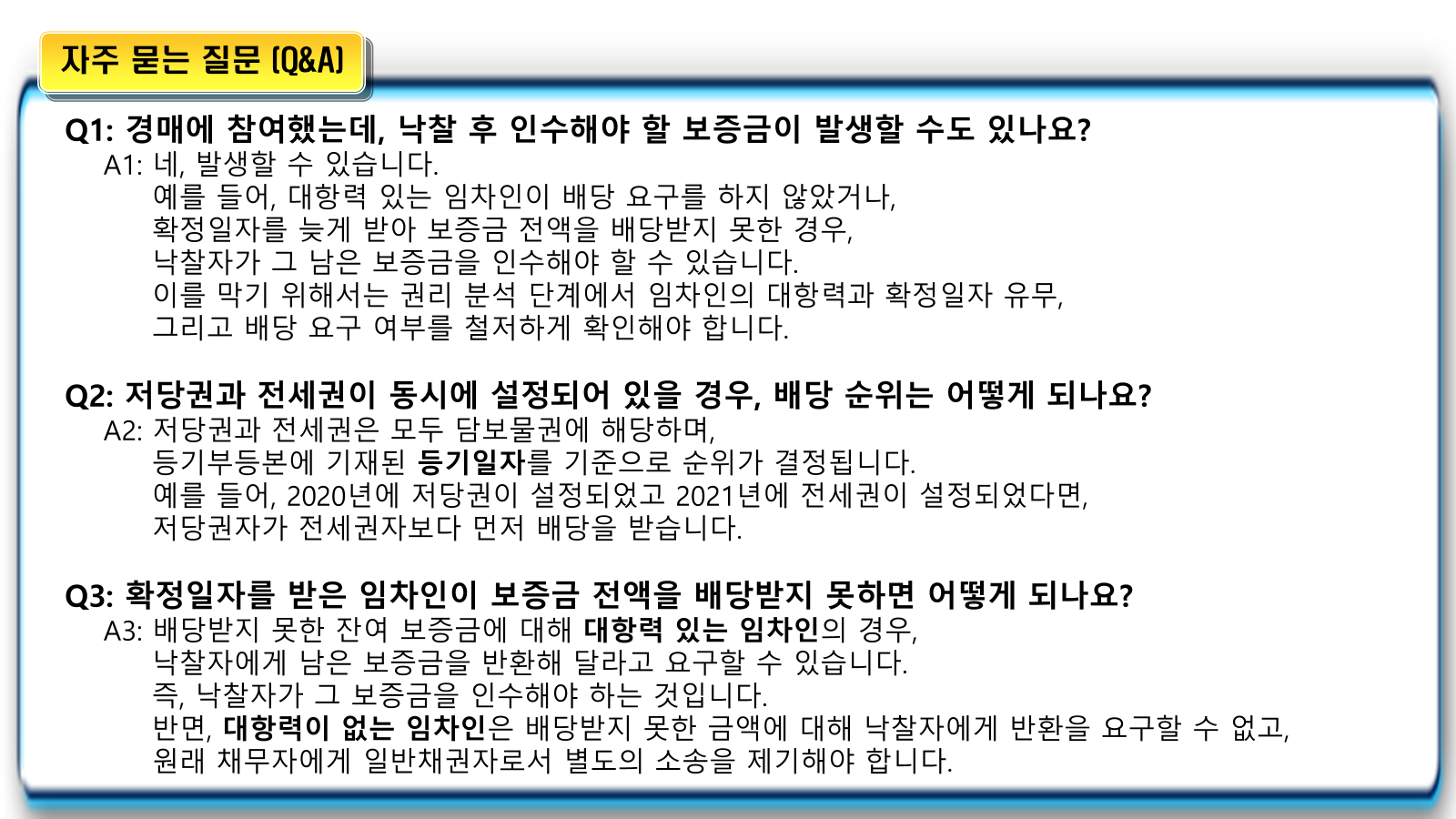 이러한 개정은 임차인이 경매 절차에서 보증금을 보호받을 수 있는 가능성을 높여주었으며, 경매 물건의 권리 분석 시 임차인과 세금의 선후 관계를 더욱 면밀하게 파악해야 하는 중요성을 강조하고 있습니다.