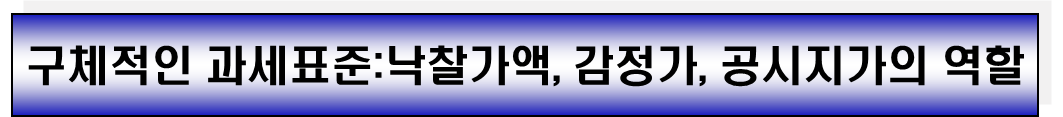 - 공시지가: 주택 공시가격과 같이 토지의 적정 가격을 산정한 것이며, 재산세나 양도소득세 등 다른 세금의 기준이 될 수 있지만, 취득세의 과세표준으로는 사용되지 않습니다. (단, 과세관청이 낙찰가액이 시가표준액보다 현저히 낮은 경우 등 예외적으로 시가표준액을 적용할 수 있습니다. 그러나 경매의 경우 대부분 낙찰가액을 인정합니다.)