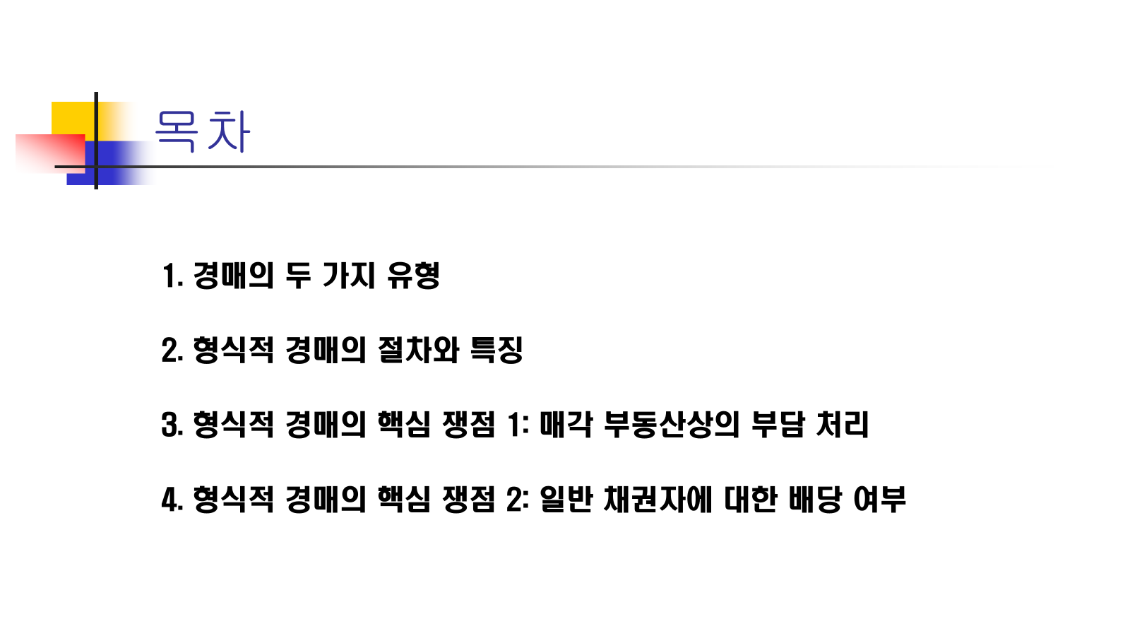 - 정의: 특정 재산의 가격 보존 또는 정리 및 현금화를 주목적으로 하여 실행되는 경매를 말해요. 채권의 만족 자체가 직접적인 목적은 아니라는 점에서 실질적 경매와 구별됩니다.
