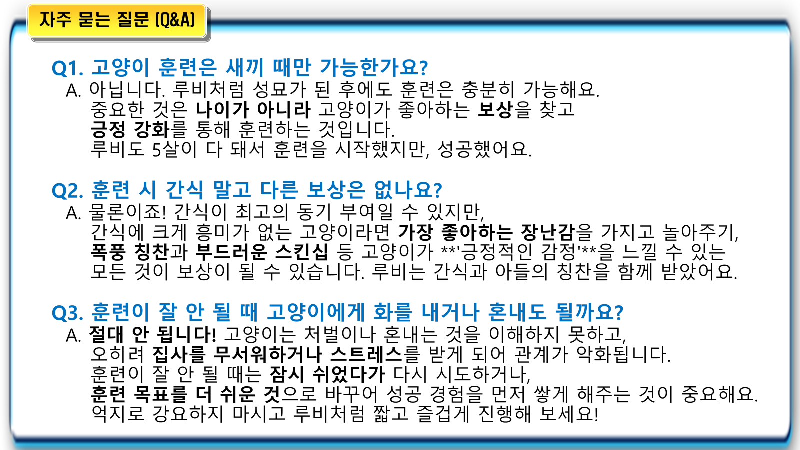 루비의 사례는 고양이 훈련의 핵심이 **'긍정 강화(Positive Reinforcement)'**에 있다는 것을 명확하게 보여줍니다. 훈련은 고양이에게 스트레스가 아닌, 집사와 함께하는 재미있는 놀이여야 해요.