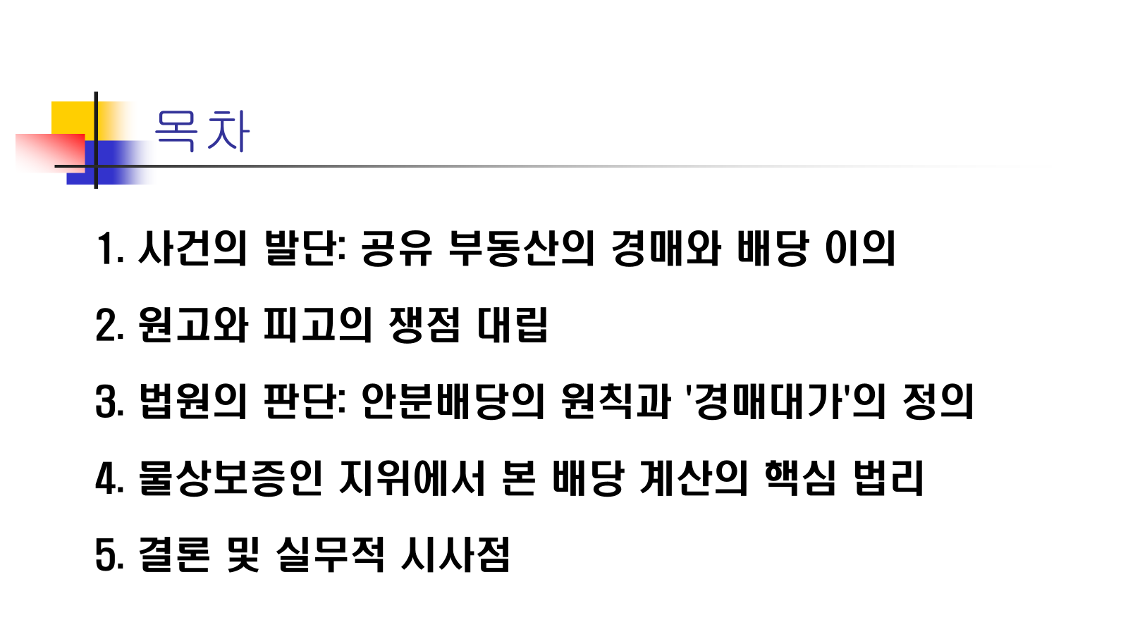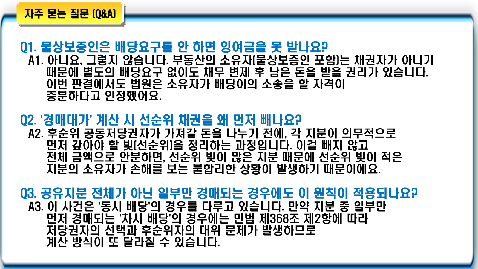 - 계산의 복잡성 인정: 단순히 1/N로 계산했다가는 실제 배당 현장에서 큰 오차가 발생할 수 있습니다. 반드시 선순위 공제 후 '경매대가'를 산출해야 합니다.