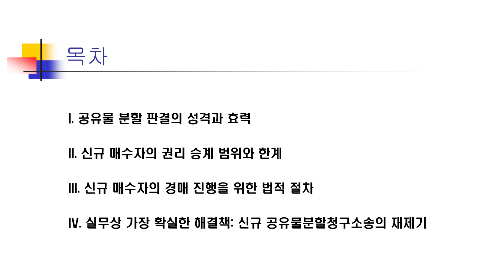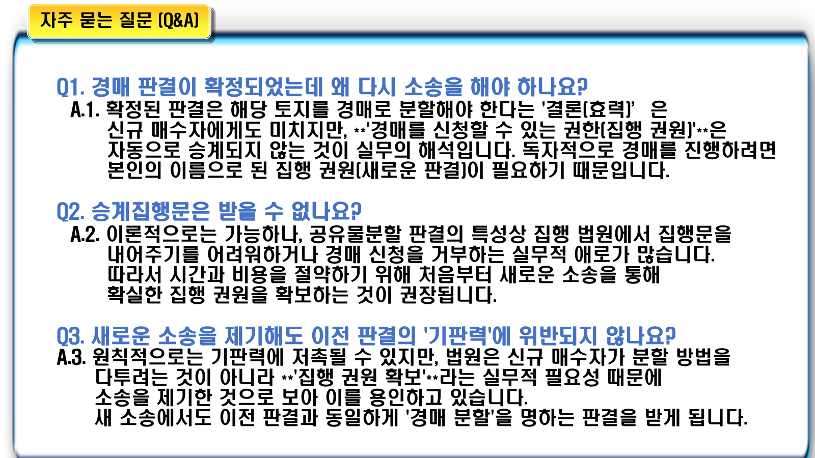 - 그러나, 신규 매수자는 이전 판결의 효력을 승계받아 '경매 분할' 이외의 다른 분할 방법을 주장할 수 없을 뿐, 경매 집행을 위한 집행 권원을 확보할 필요성이 존재합니다.