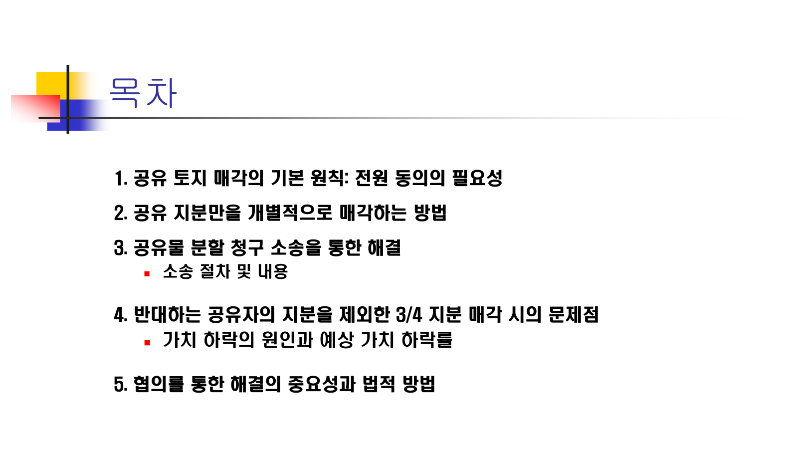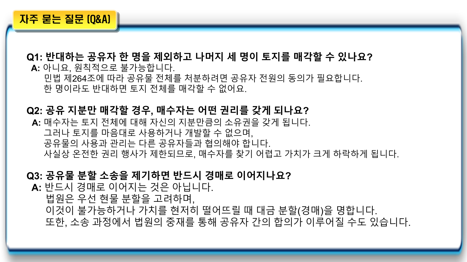 - 미래의 불확실성: 새로운 매수자는 반대하는 기존 공유자와 관계를 맺어야 하고, 향후 발생할 수 있는 분쟁에 노출됩니다. 또한, 언제든 다른 공유자가 공유물 분할 청구 소송을 제기할 수 있어 소유권이 불안정해집니다.