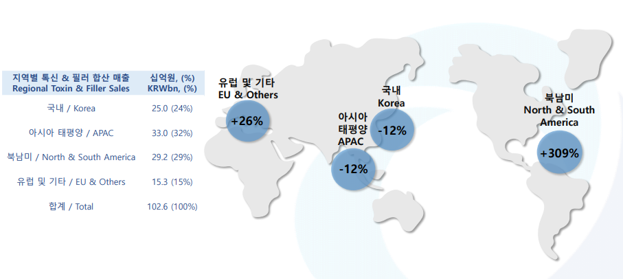 - 미국과 브라질을 포함한 북남미 지역의 톡신·필러 합산 매출은 679억원으로 전년 대비 105% 성장했습니다.