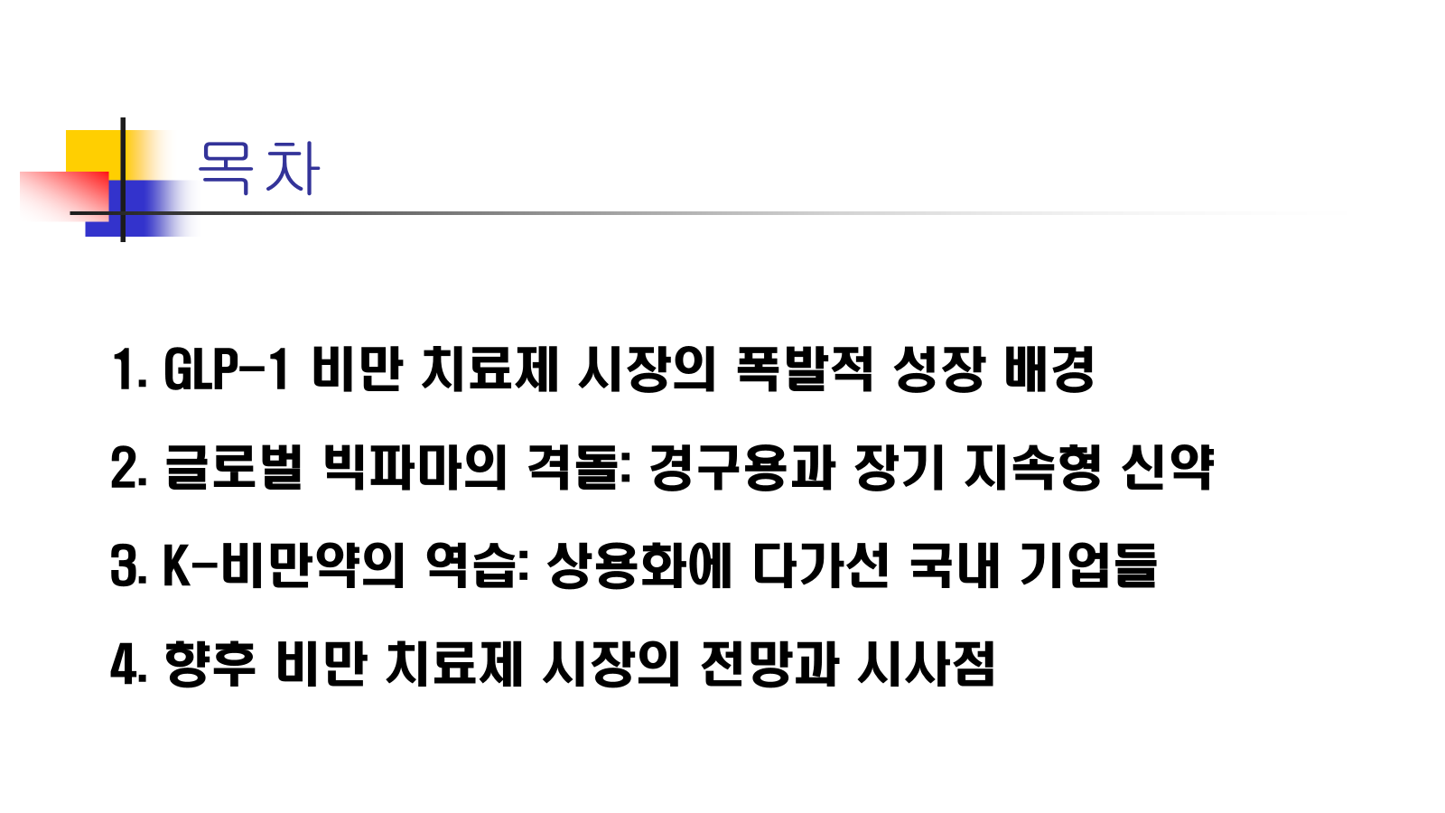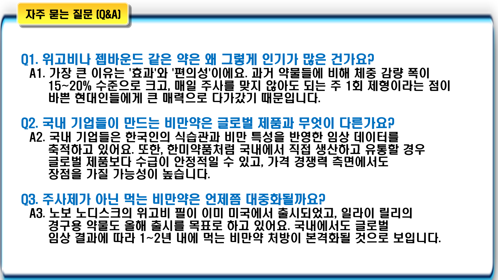 비만 치료제는 이제 단순히 '살을 빼는 약'을 넘어 당뇨, 심혈관 질환 등 다양한 대사 질환 치료의 핵심으로 떠오르고 있습니다. 글로벌 시장은 경구용 제제와 장기 지속형 주사제로 재편될 것으로 보이며, 국내 기업들은 한국 시장에서의 성공을 발판 삼아 글로벌 시장으로의 기술 수출이나 직접 진출을 꾀할 것으로 예상됩니다.