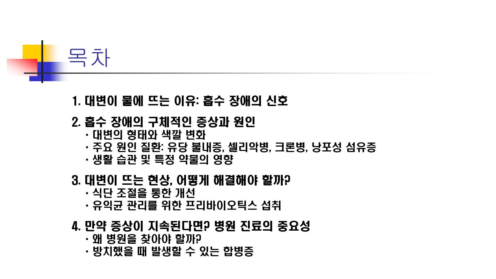 대변이 뜨는 현상이 심각한 질병의 징후일 수 있기 때문입니다. 전문의는 정확한 진단을 통해 원인을 파악하고, 그에 맞는 치료 계획을 세워줄 수 있습니다. 섣불리 자가 진단하고 방치하면 병이 더 악화될 수 있으므로, 조기에 의료진의 도움을 받는 것이 매우 중요합니다.