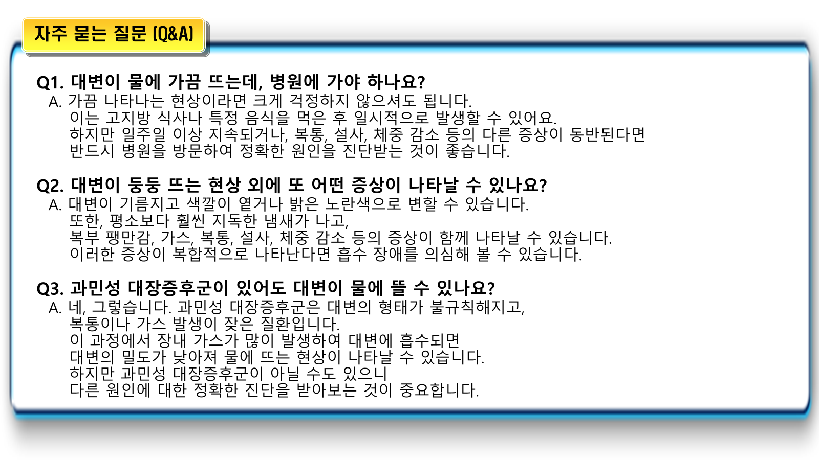 만약 위와 같은 노력에도 불구하고 대변이 물에 뜨는 현상이 자주 나타나거나, 다른 증상(지속적인 설사, 복통, 체중 감소 등)이 동반된다면, 반드시 전문의를 찾아 진료를 받아야 합니다.