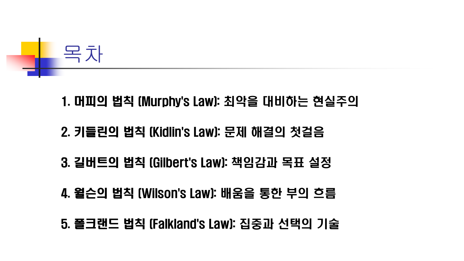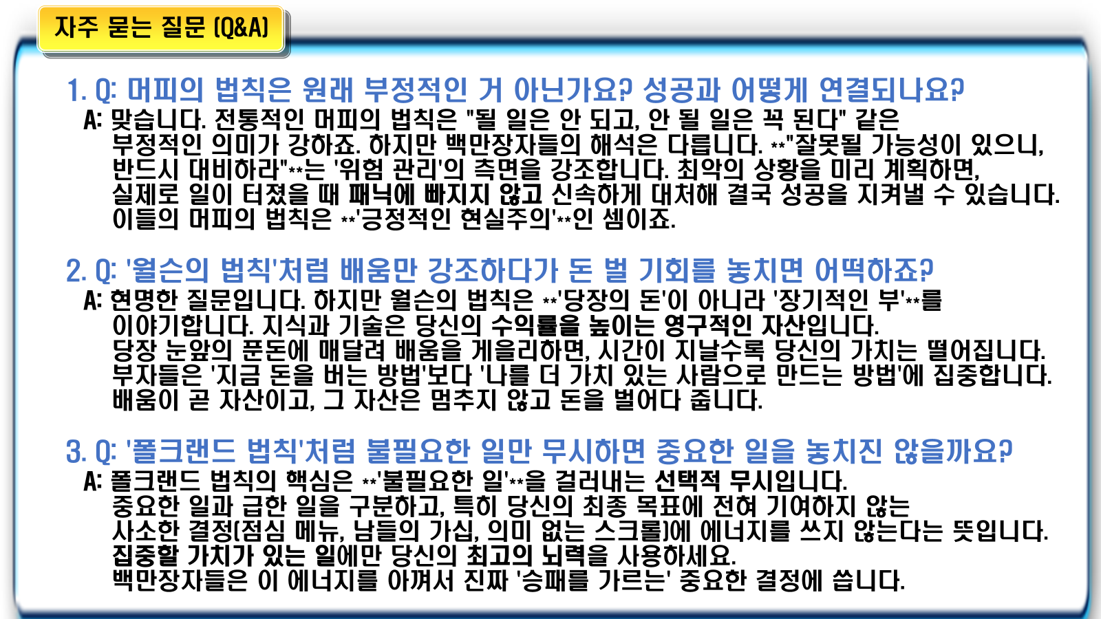 이 법칙들은 결국 '생각하는 방식'을 바꾸어 성공을 끌어당기는 심리적인 지침들입니다. 부자들이 괜히 부자가 된 게 아니죠.