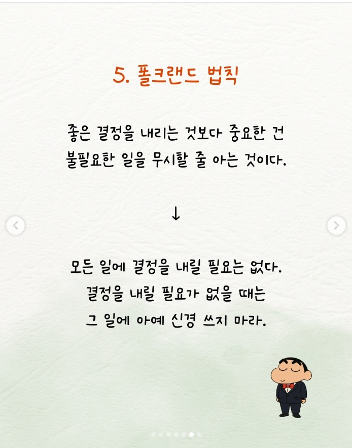 • 짧은 에피소드: 짱구 아빠는 늘 똑같은 무난한 넥타이를 맵니다. "넥타이 색깔 고르는데 3분 낭비할 시간에, 3억짜리 계약 성사시킬 전략을 생각해야지!" 사소한 것을 무시하는 힘이 그를 핵심 인재로 만듭니다.