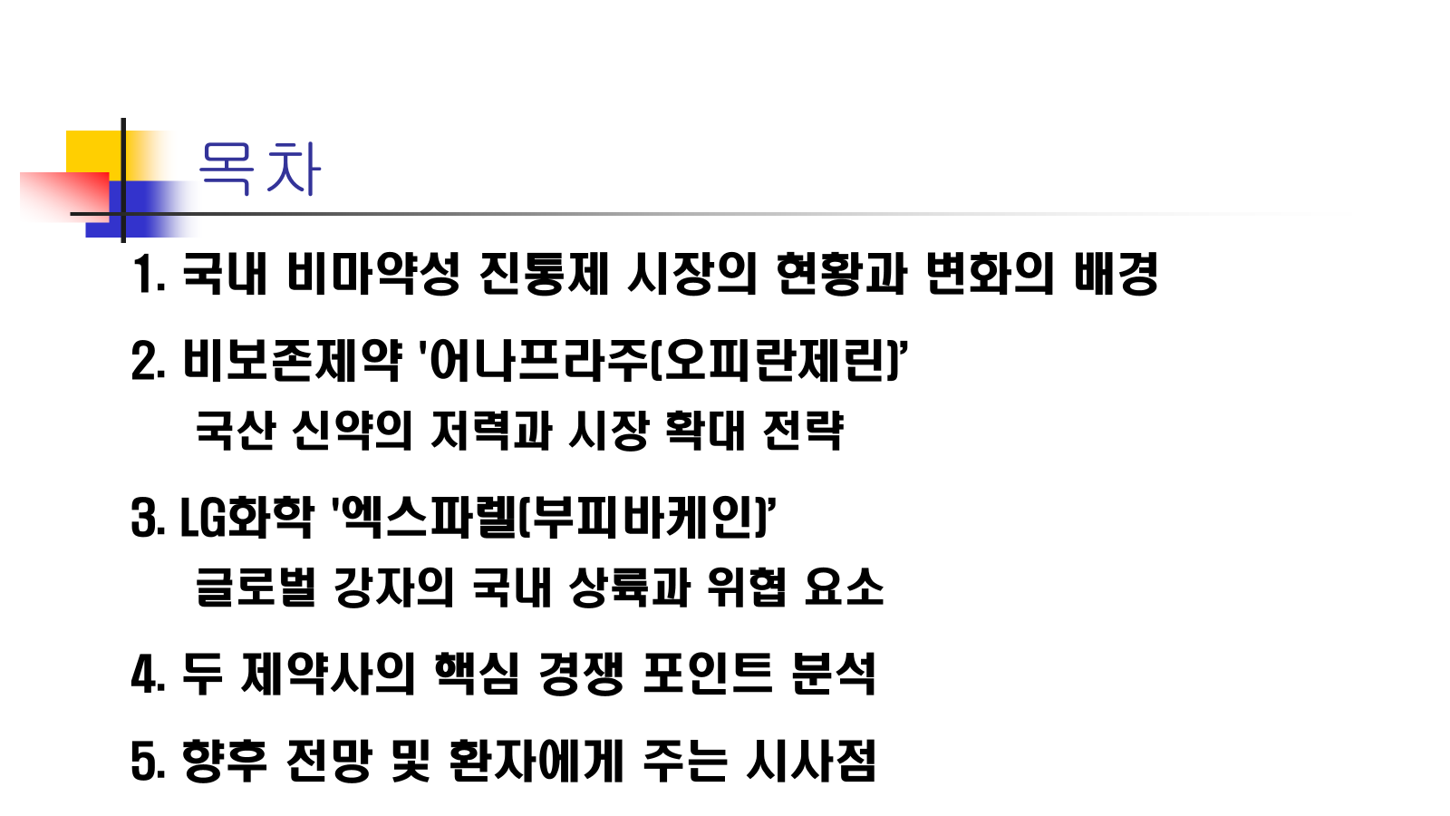 국내 비마약성 진통제 시장의 대격돌: 비보존제약 '어나프라주' vs LG화학 '엑스파렐'