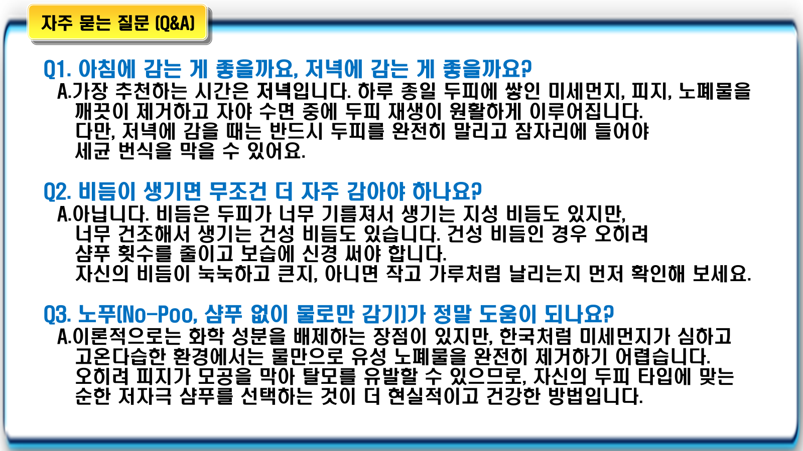 - 건성 두피: 오염이 심한 부위 위주로 짧게 문지르고 빠르게 헹구어 수분 손실을 최소화하는 것이 좋습니다.