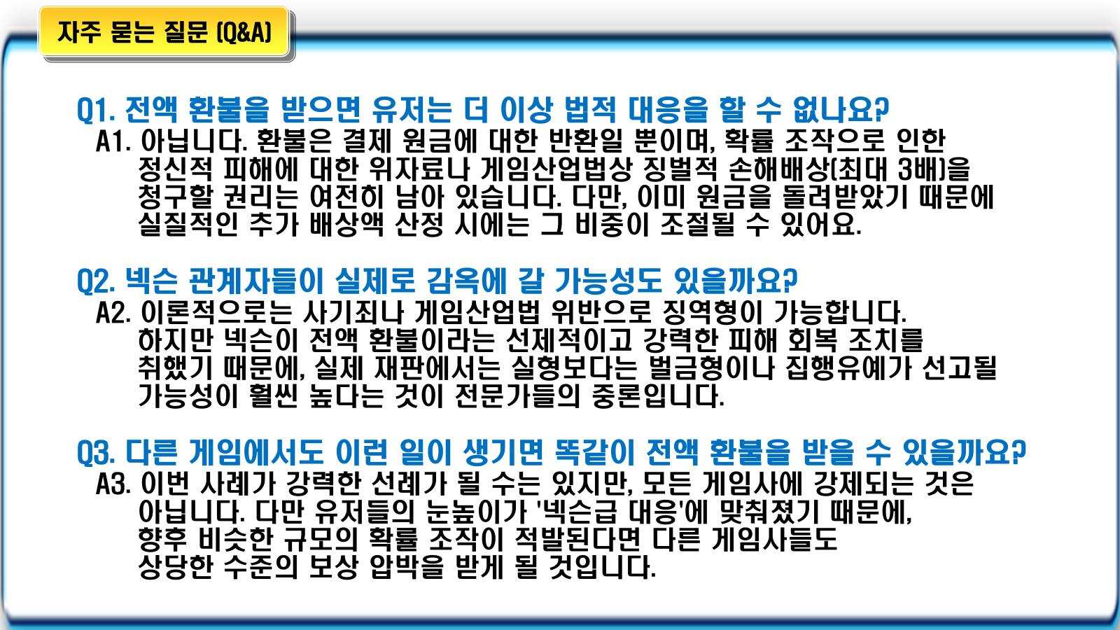 - 만약 유저들이 단순 환불 이상의 정신적 피해나 기회비용 상실을 주장하며 소송을 제기하고, 넥슨의 고의성이 입증된다면 환불 금액 이상의 배상이 필요할 수도 있습니다.