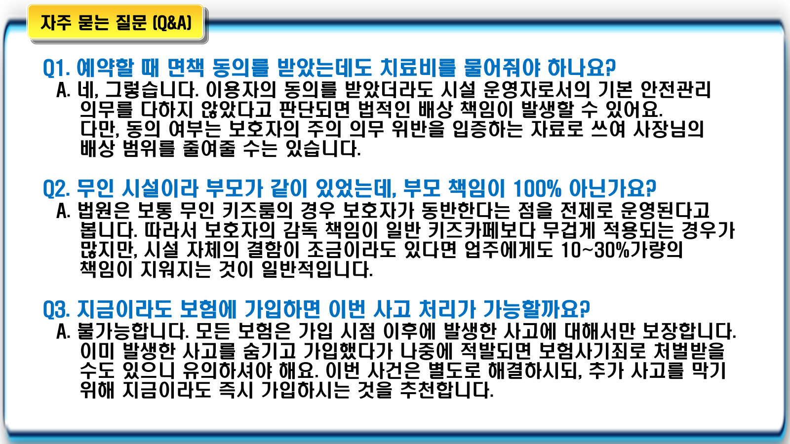특히 영업배상책임보험에 가입하지 않은 상태에서 큰 사고가 발생하면 업주는 막막한 상황에 처하게 됩니다. 본 포스팅에서는 최근 사례를 바탕으로 무인 키즈룸 내 사고 발생 시 법적 책임의 범위, 면책 공지의 효력, 그리고 보험 미가입 시 현실적인 대응 전략을 상세히 정리해 드립니다.