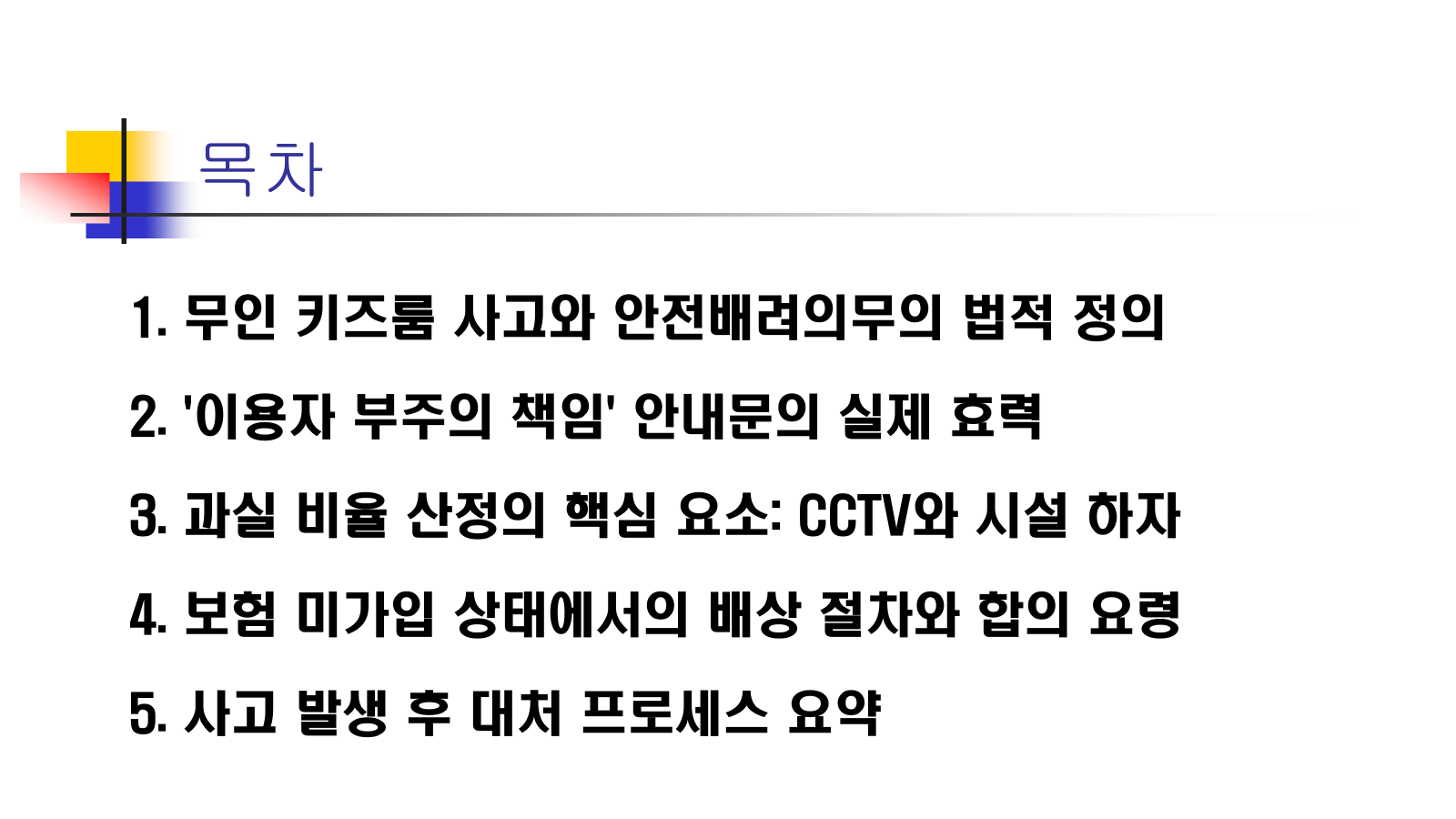 법적 분쟁으로 이어질 경우 핵심은 **'과실 비율(누가 더 잘못했는가)'**을 따지는 것입니다. 무인 키즈룸 사고에서 과실 비율을 결정하는 주요 요소는 다음과 같습니다.