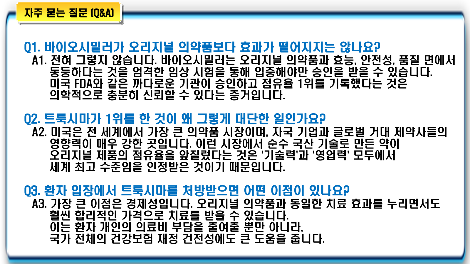 - 미국 의료진들은 보수적인 처방 성향을 가지고 있지만, 트룩시마는 방대한 임상 데이터를 통해 오리지널과 동등한 효능 및 안전성을 입증했어요.