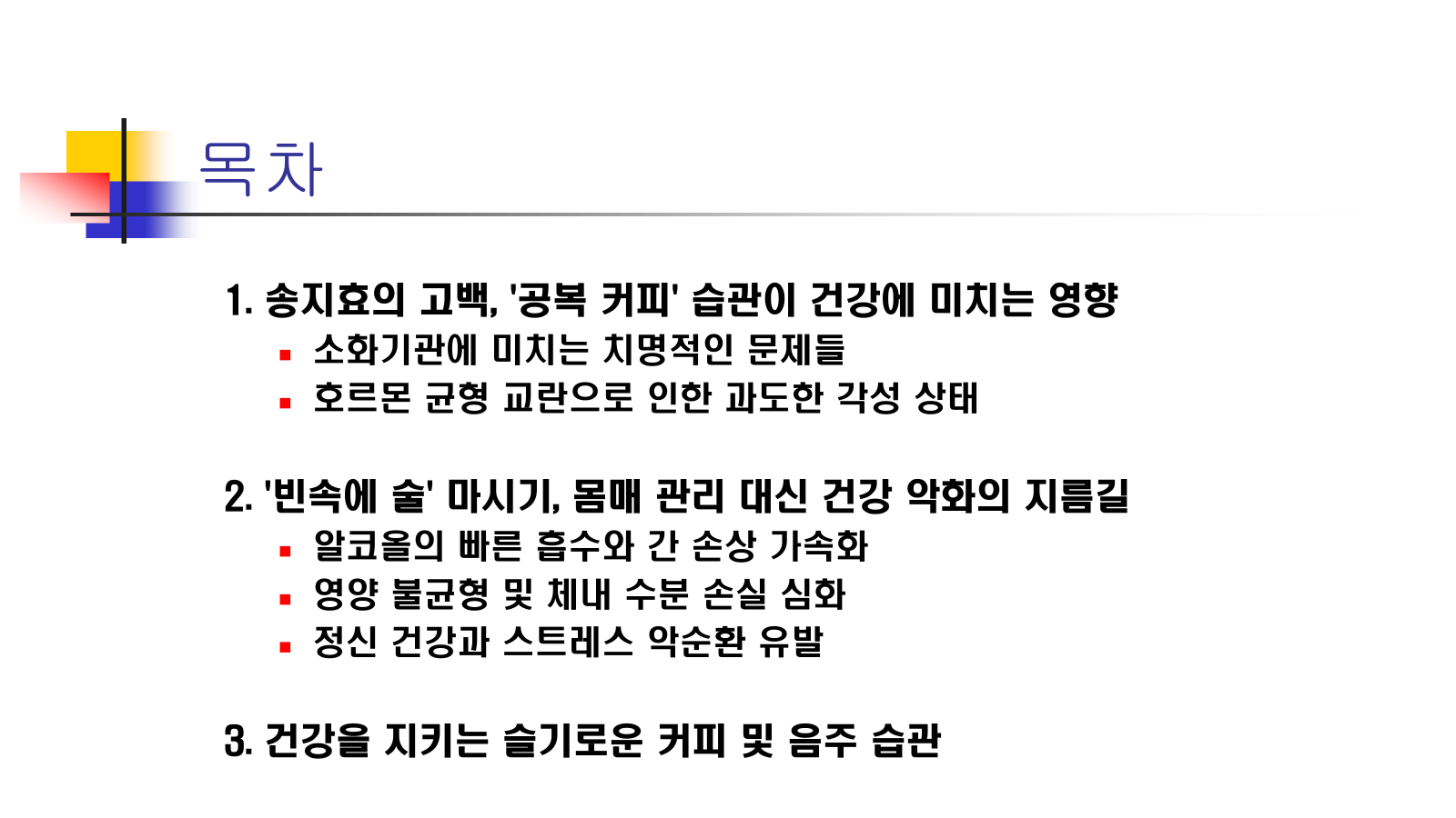 송지효 씨의 사례는 바쁜 현대인들이 건강에 해로운 습관에 얼마나 쉽게 노출될 수 있는지를 보여줍니다. 건강을 지키기 위한 몇 가지 간단하고 실용적인 대안을 제시해 드립니다.