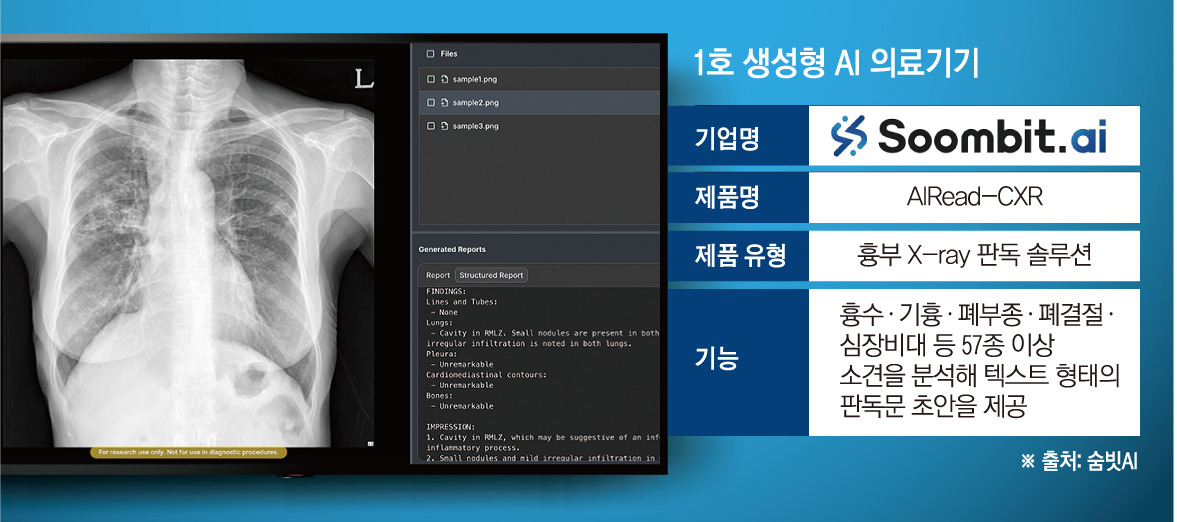 - 생성형 AI 방식: 이번에 승인된 제품은 흉부 X선 영상을 분석한 뒤, 전문의가 작성하는 것과 유사한 텍스트 형태의 예비 소견서를 즉시 생성합니다.