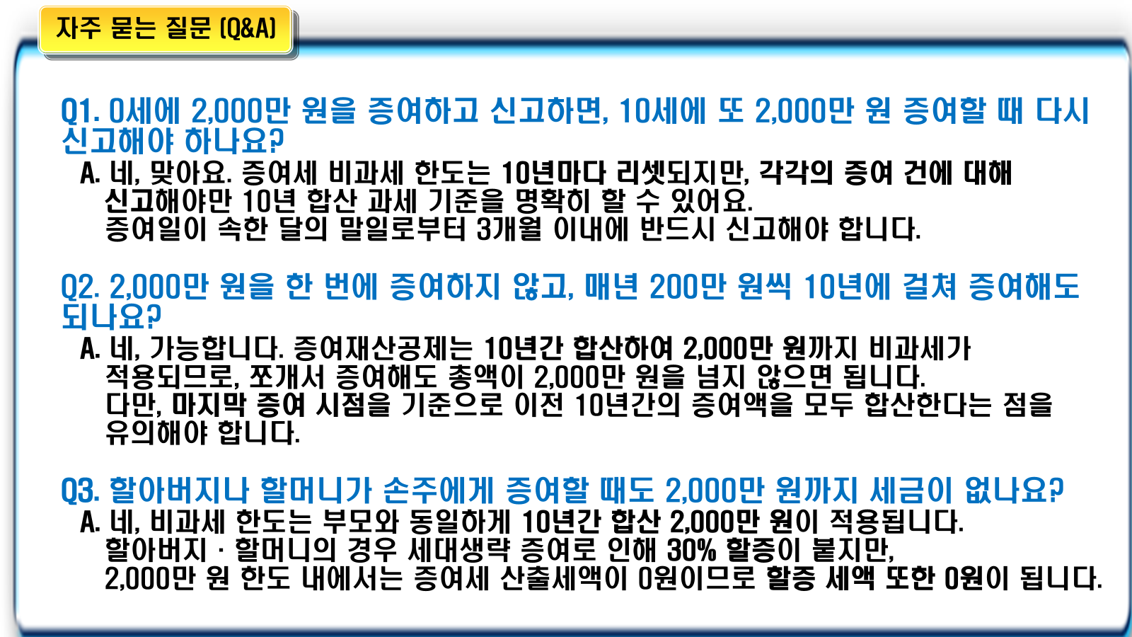 - 비과세 효과: 손자녀가 증여재산공제 한도인 2,000만 원 내에서 증여받으면, 증여세 산출세액은 0원이 됩니다.