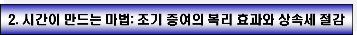 조기 증여의 또 다른 강력한 이점은 **'시간을 내 편으로 만드는 복리 효과'**입니다. 증여받은 자산이 스스로 불어날 수 있는 충분한 시간을 확보해 주는 것입니다.