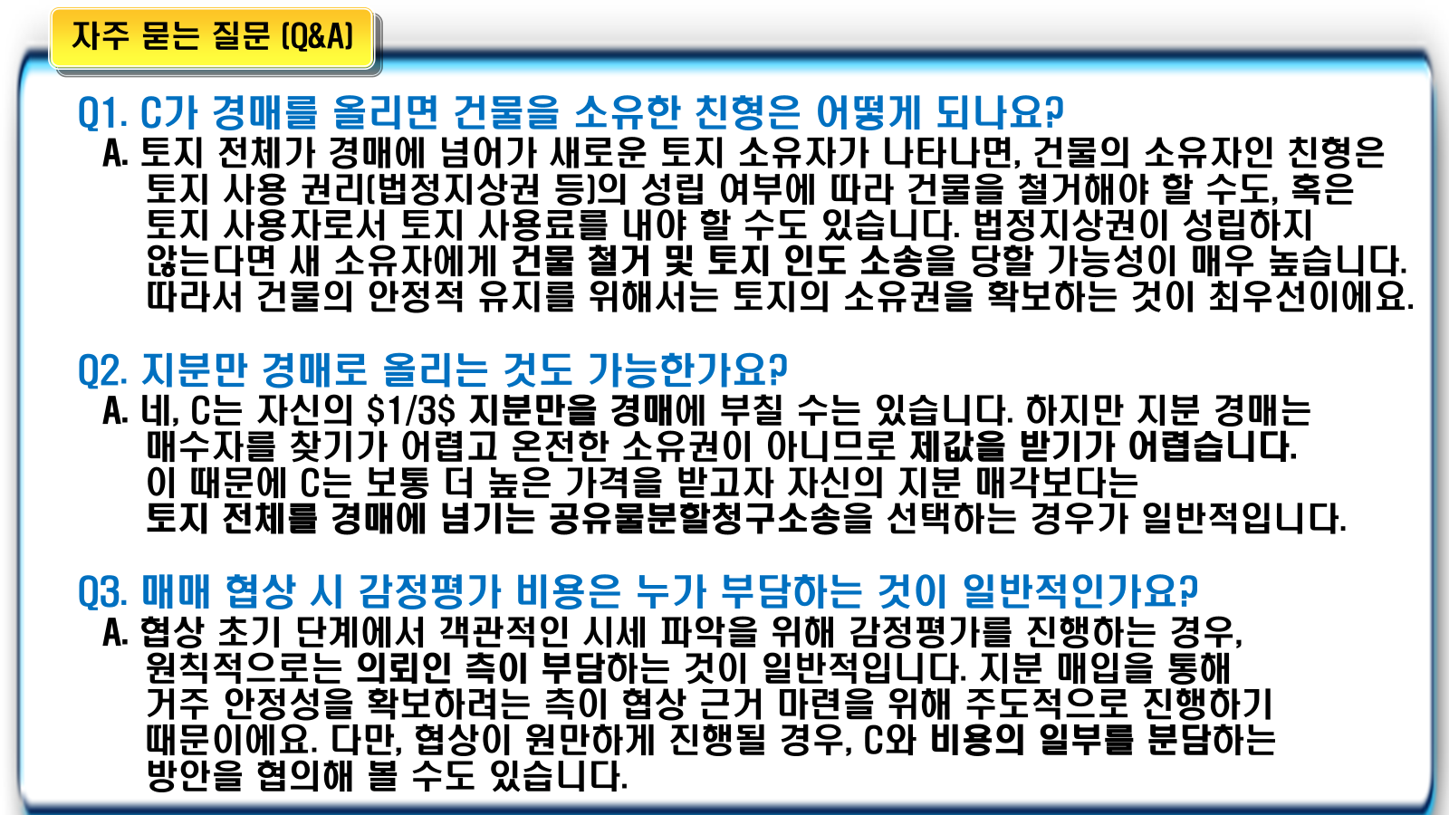 - 나. 경매 분할의 단점: 경매로 진행될 경우, C 역시 법적 비용과 시간, 그리고 경매 과정에서의 매각 대금 감소 위험을 감수해야 합니다.