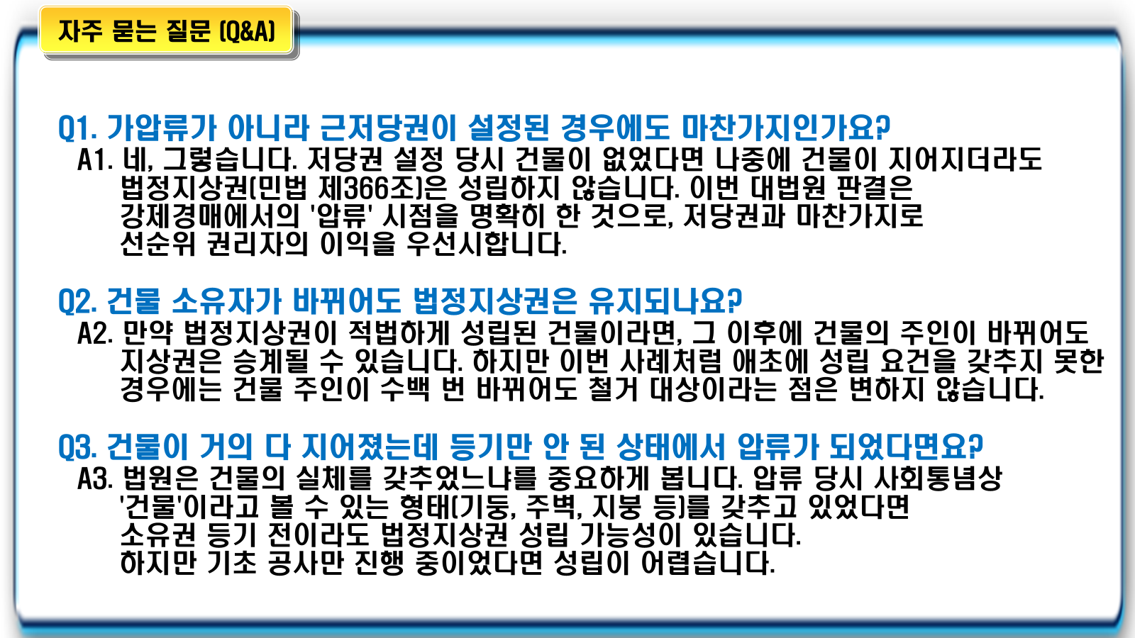 이 제도는 건물이라는 사회적 자산이 철거됨으로써 발생하는 경제적 손실을 막기 위해 존재합니다. 하지만 토지 소유자의 재산권과 충돌하기 때문에 그 성립 범위를 엄격하게 제한하고 있습니다.