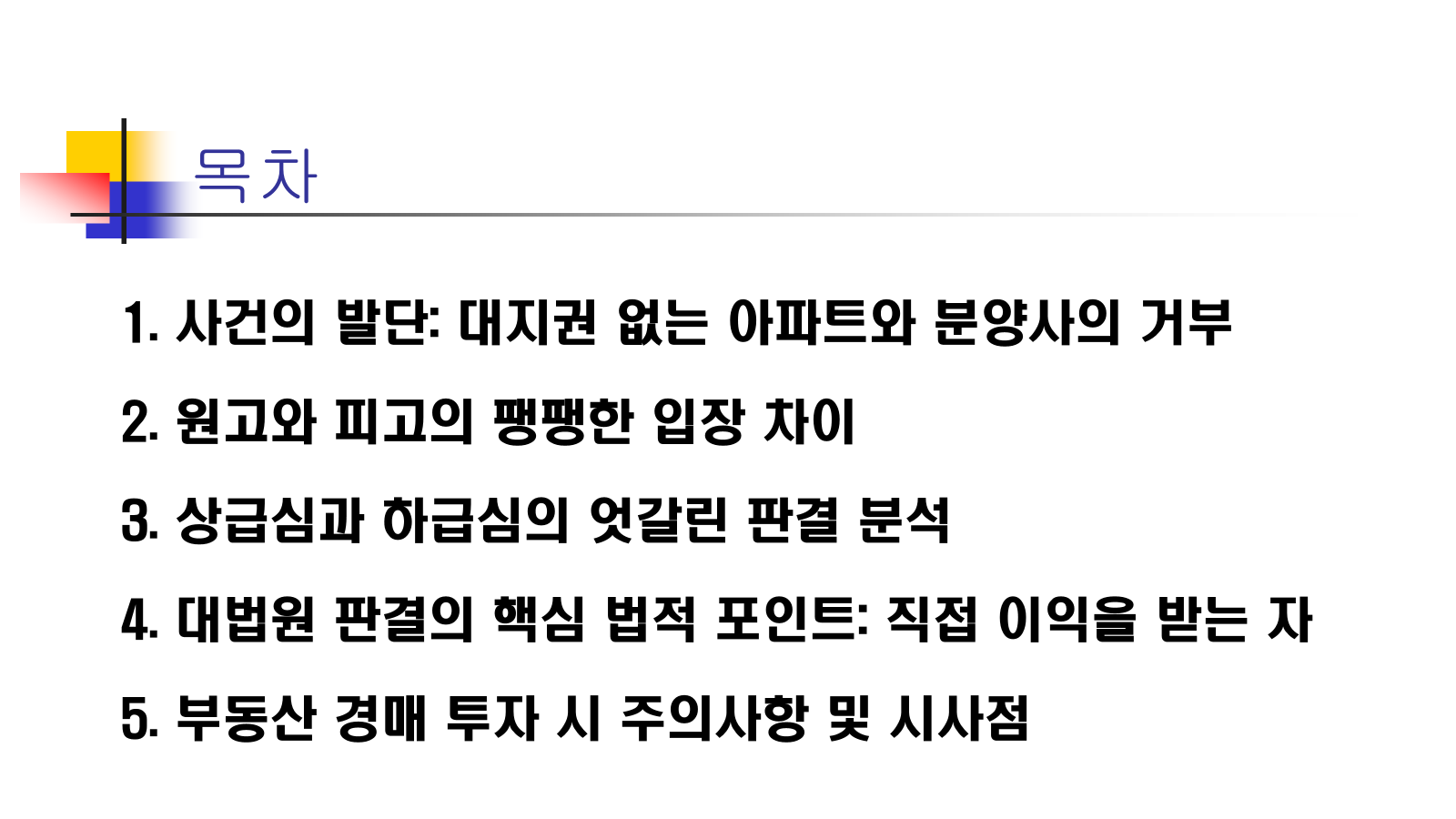 • 나는 경매 절차를 통해 합법적으로 건물을 취득했으며, 대지사용권은 건물에 종속되는 권리이므로 당연히 내 소유입니다.