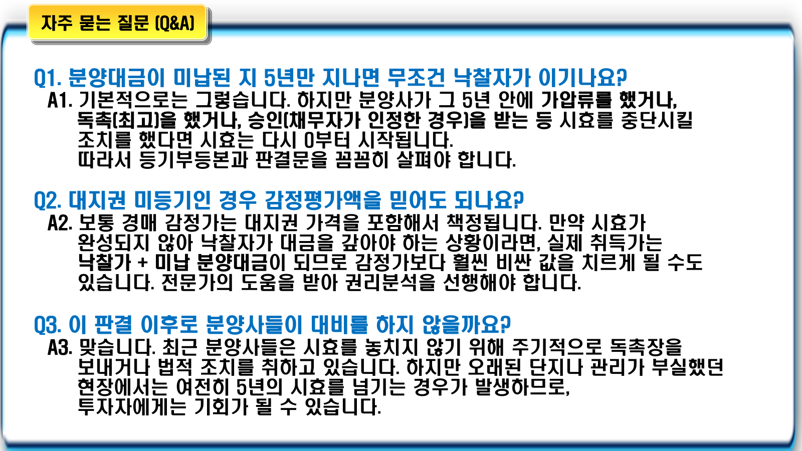 • 이 부담의 근거가 되는 분양대금 채권이 시효로 소멸한다면, 낙찰자는 그 부담을 벗어나 아무런 조건 없이 대지권을 얻게 됩니다.