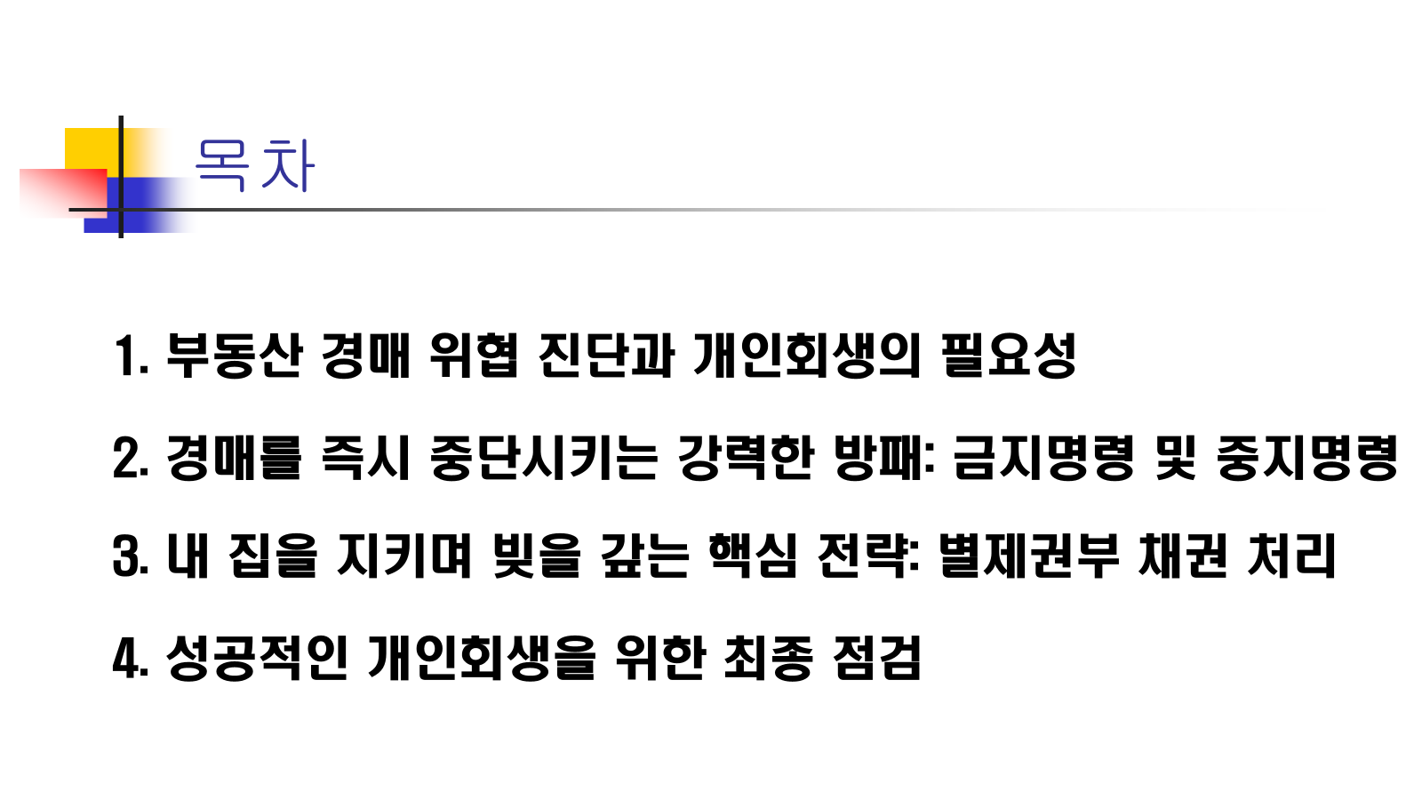 과거에 개인회생을 통해 담보대출을 받으셨다면, 어쩌면 이전 회생 절차에서 이 집 담보대출이 **'별제권'**으로 분류되어 별도로 갚아나가고 있었을 가능성을 시사합니다. 하지만 그 변제가 제대로 이루어지지 않아 결국 경매 위기에 처한 지금, 이 문제를 해결할 유일한 열쇠는 새로운 개인회생 절차를 통해 법원의 보호를 받는 것입니다.