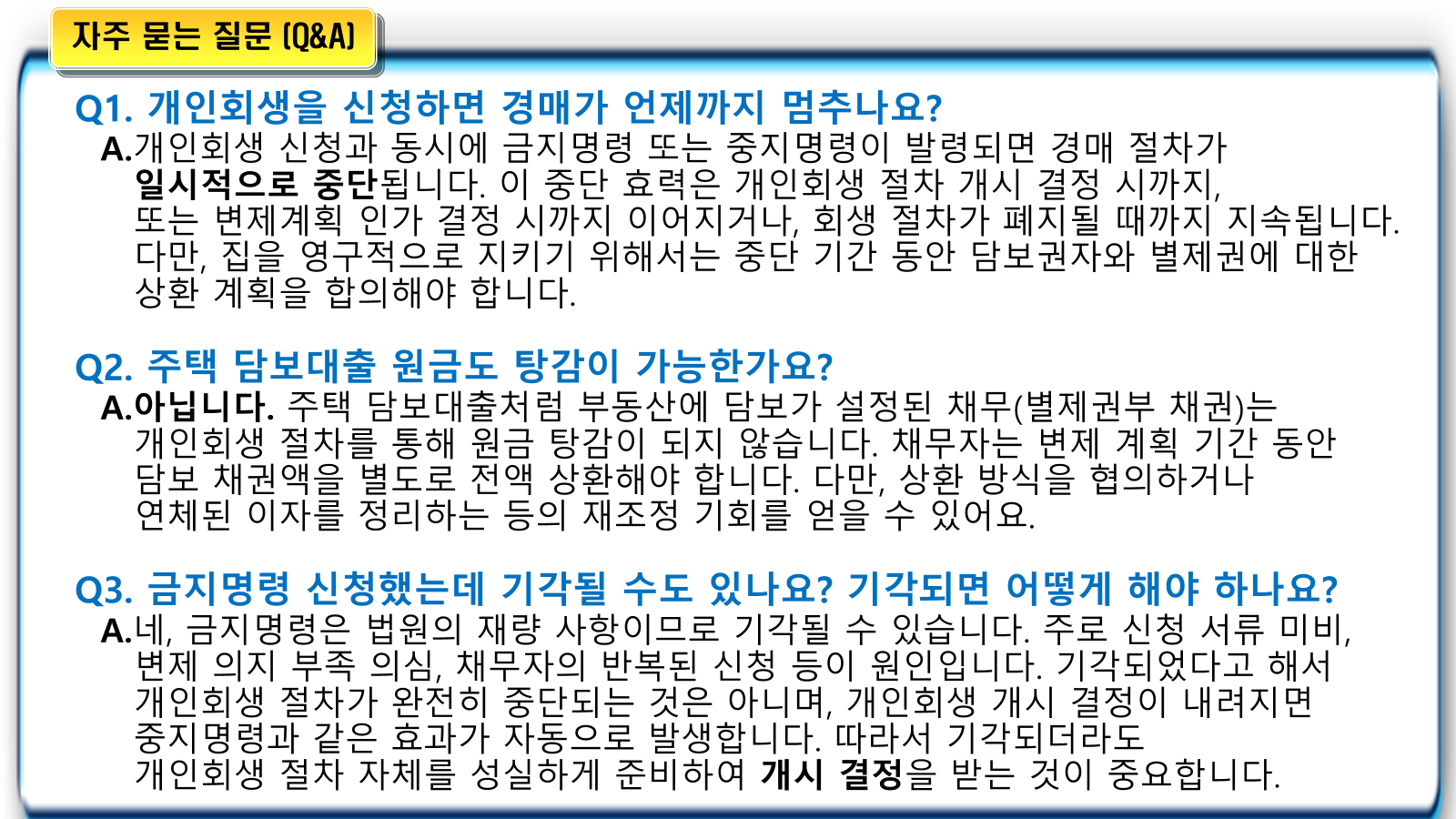- 경매 중단의 의미: 금지명령은 경매 진행을 일시적으로 중단시키지만, 담보권(별제권)의 존재 자체를 없애는 것은 아닙니다. 따라서 집을 영구적으로 지키기 위해서는 담보권자와의 협상이 필수적이에요.