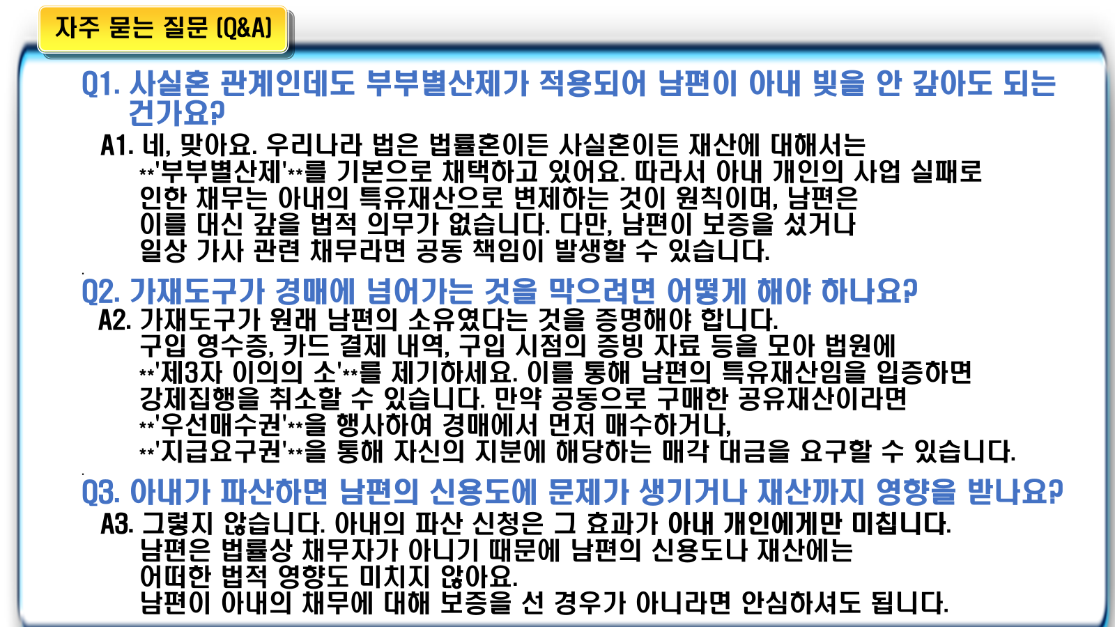 사실혼 관계는 법적으로 혼인 신고를 하지 않았지만, 실제로 부부처럼 생활하는 경우를 말합니다. 이러한 사실혼 관계에서도 부부 공동생활에 따른 다양한 법률 문제가 발생할 수 있는데, 특히 한쪽 배우자의 사업 실패로 인한 채무는 큰 고민거리가 됩니다. 배우자의 어려운 상황을 외면할 수 없는 마음과 함께, 법적으로 이 빚을 대신 갚아야 하는지에 대한 궁금증이 생기게 마련입니다. 최근 소개된 실제 사연과 전문가의 조언을 바탕으로, 사실혼 배우자의 채무와 강제집행으로부터 가재도구를 보호하고 현명하게 대처하는 방법을 자세히 알아보겠습니다.