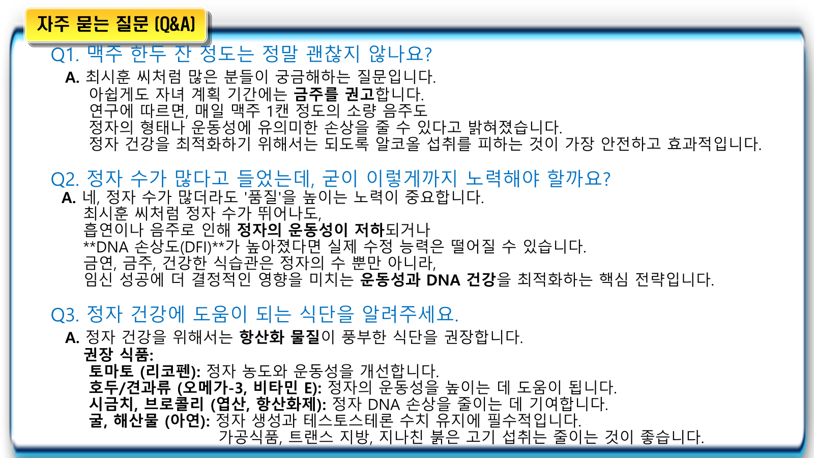 - 과학적 근거: 흡연과 음주는 정자의 운동성, 형태, DNA 손상도에 직접적인 악영향을 미칩니다. 이러한 유해 요소들을 제거하는 것은 곧 정자의 '품질 개선'으로 이어집니다.