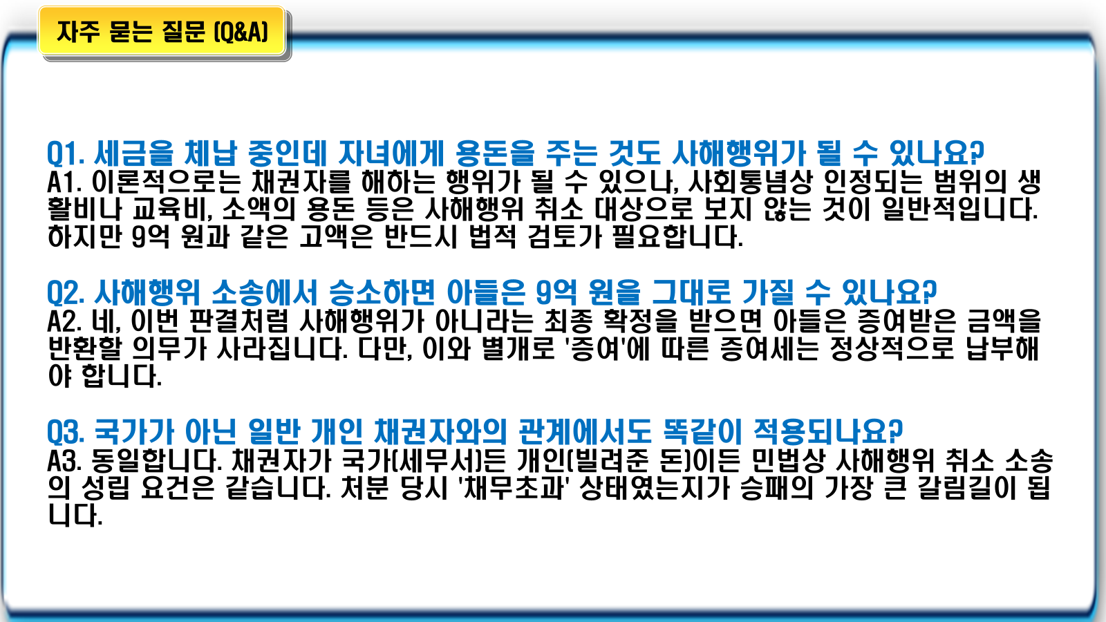 - 채무초과 상태의 부정: 설령 법원이 이를 증여로 보더라도, 증여 당시 아버지의 전체 자산(적극재산)이 부채(소극재산)보다 훨씬 많았음을 강조했습니다. 즉, 9억 원을 주었어도 여전히 빚을 갚을 능력이 충분했으므로 사해행위 자체가 성립할 수 없다는 논리입니다.