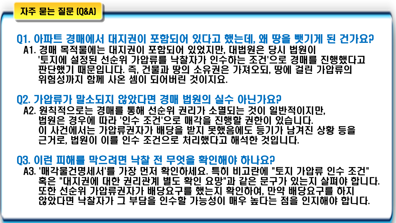 이번 판결은 경매 참가자들에게 아주 중요한 교훈을 줍니다. "경매로 낙찰받으면 모든 권리는 깨끗해진다"는 일반적인 믿음이 항상 통하는 것은 아니라는 점이죠.