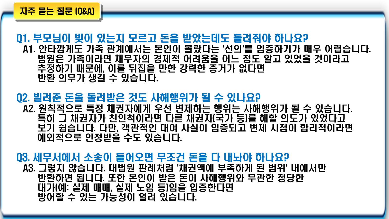 - 양도소득세와 같은 고액 채무가 발생할 예정이라면, 재산 처분 전에 반드시 세무사나 변호사의 자문을 받아 사해행위 여부를 검토해야 합니다.