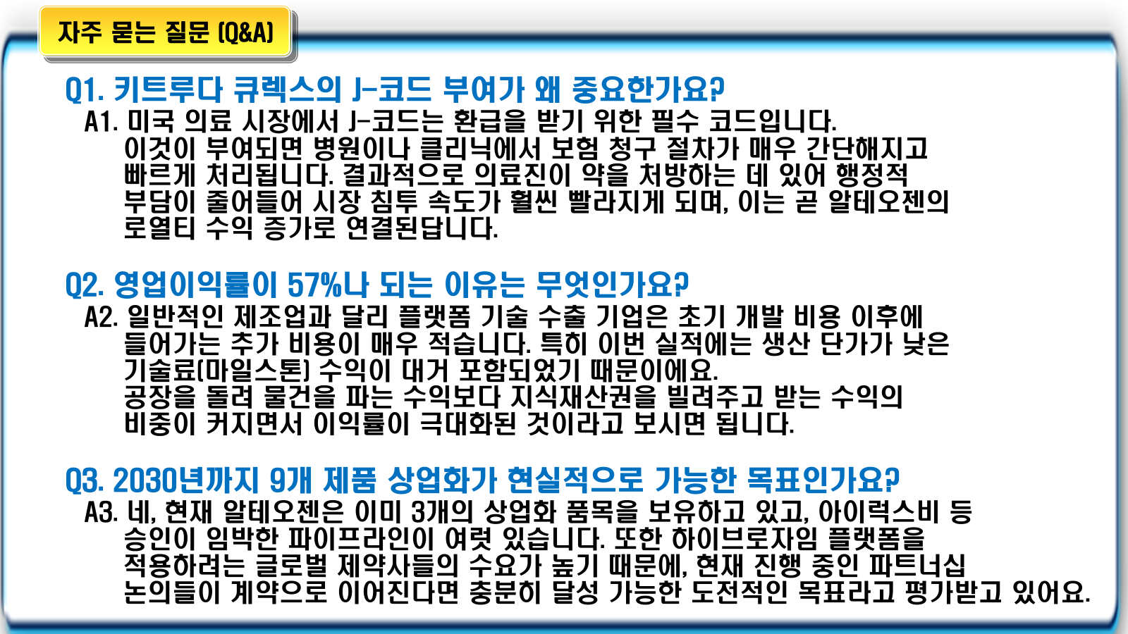앞으로 투자자와 시장 참여자들은 키트루다 큐렉스의 J-코드 부여 이후 판매 추이, 아이럭스비의 유럽 시장 안착 여부, 그리고 GSK 테사로 외에 추가적으로 발표될 신규 기술 수출 소식에 주목할 필요가 있습니다. 알테오젠의 성장은 이제 막 본격적인 궤도에 진입한 것으로 보입니다.