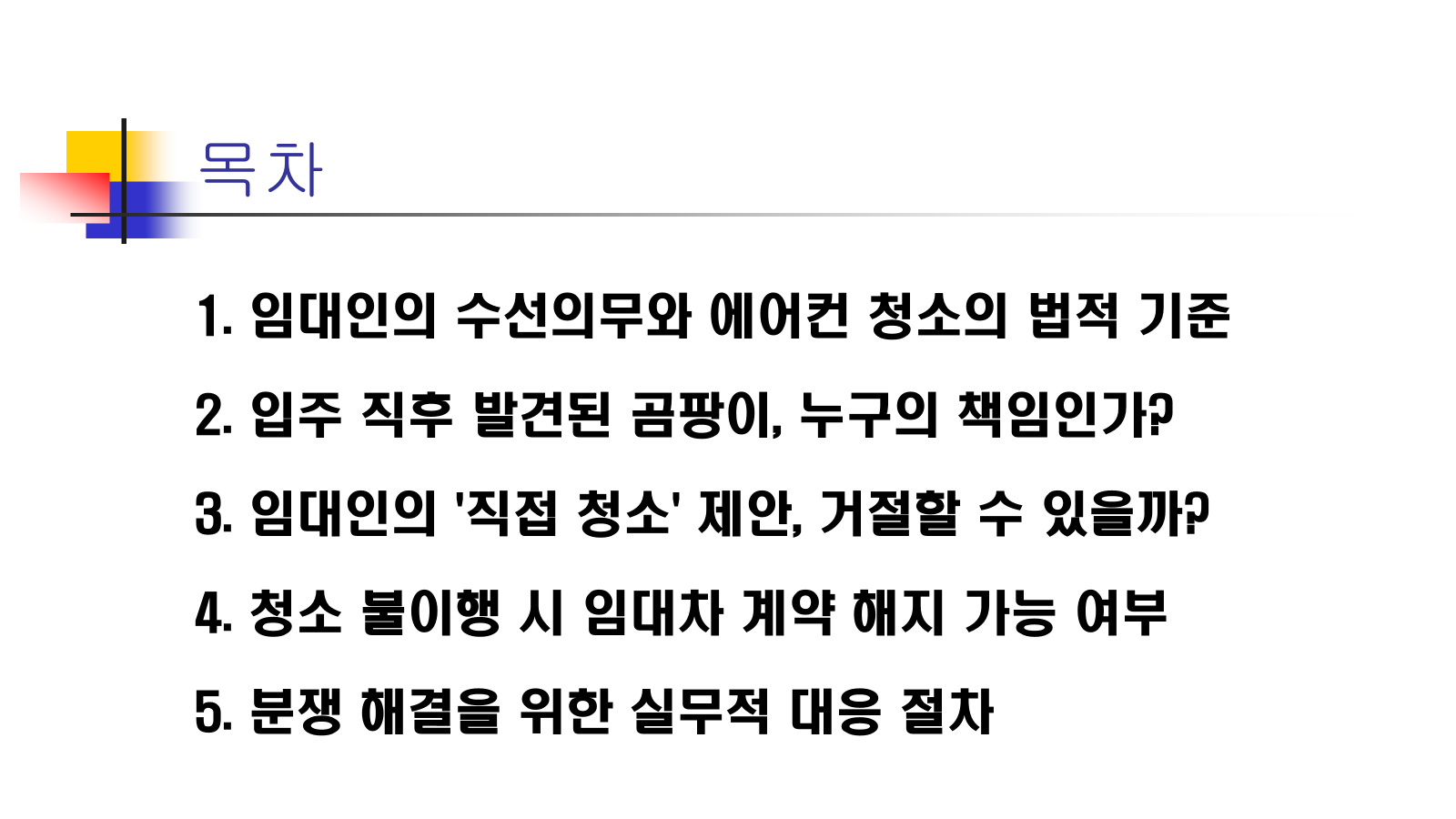 - 도저히 협의가 안 된다면 세입자가 먼저 사비로 청소하고, 그 비용을 임대료에서 공제하거나 임대인에게 청구(필요비 상환청구권)할 수도 있습니다. 다만, 이는 임대인과의 갈등을 심화시킬 수 있으니 주의가 필요해요.