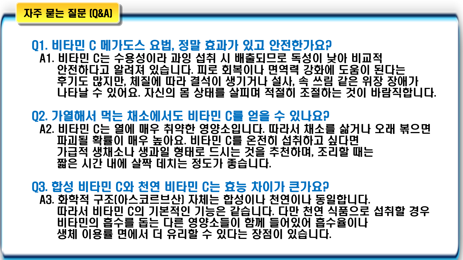 최근에는 고용량을 복용하는 '메가도스 요법'이 유행하기도 하지만, 전문가들은 무엇보다 자연적인 음식을 통한 섭취를 강조합니다.
