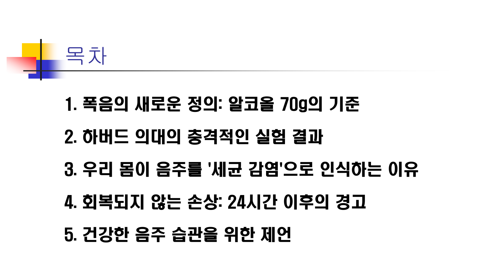 안녕하세요! 평소 술자리 즐거우신가요? "나는 주량이 소주 한 병 반 정도라 딱 기분 좋게 마신다"라고 말씀하시는 분들이 주변에 참 많습니다. 하지만 우리가 흔히 '적당하다'고 생각했던 이 음주량이 사실은 우리 몸의 면역 체계를 무너뜨리는 '폭음'에 해당한다는 충격적인 연구 결과가 발표되었습니다.