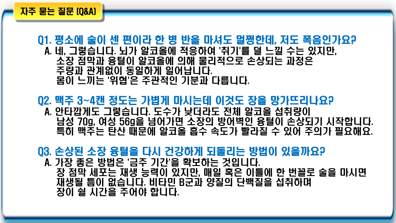 - 한 번 짧아진 융털은 재생되는 데 오랜 시간이 걸리거나, 반복적인 음주 시 영구적으로 위축될 수 있습니다. 이는 결국 만성적인 영양 불균형과 소화 불량으로 이어지게 됩니다.