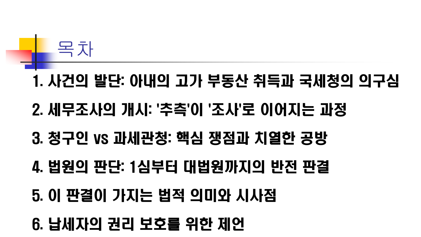 부동산을 취득한 아내의 자금 출처가 불분명하다는 이유만으로 남편의 사업장까지 샅샅이 뒤져 세금을 부과하는 것이 과연 정당할까요? 법원은 이에 대해 매우 엄격한 잣대를 들이대며 국민의 손을 들어주었습니다. 본 포스팅에서는 이 사건의 구체적인 전말과 법리적 쟁점, 그리고 우리 실생활에 주는 시사점을 심도 있게 분석해 보겠습니다.