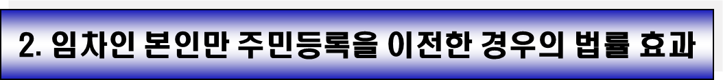 • 임차인 본인이 주소를 옮길 때, 주민등록표상에 함께 기재되어 있던 가족 중 일부라도 반드시 해당 주소지에 남아서 주민등록을 유지해야 합니다.