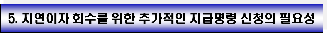 따라서 별도로 지급명령 신청을 할 필요 없이, 이 판결문을 통해 **강제집행(예: 채권압류 및 추심명령)**을 신청하여 미지급된 지연이자를 포함한 잔여 채권을 회수할 수 있습니다.