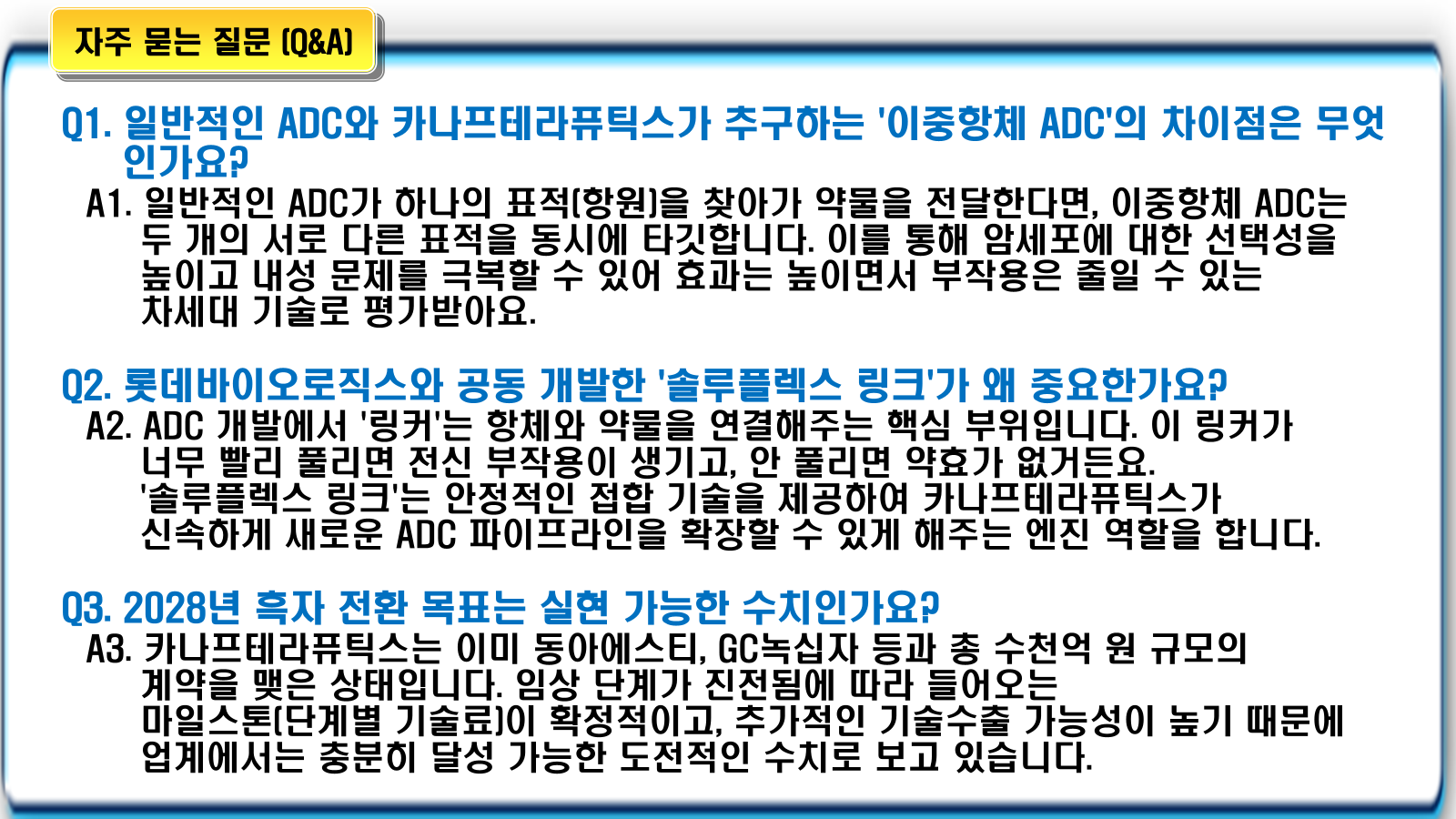 - 역할 분담: 롯데바이오로직스는 CDMO 사업에 이를 활용하고, 카나프테라퓨틱스는 이를 통해 자사 신약을 개발하는 윈윈(Win-Win) 전략을 취하고 있습니다.