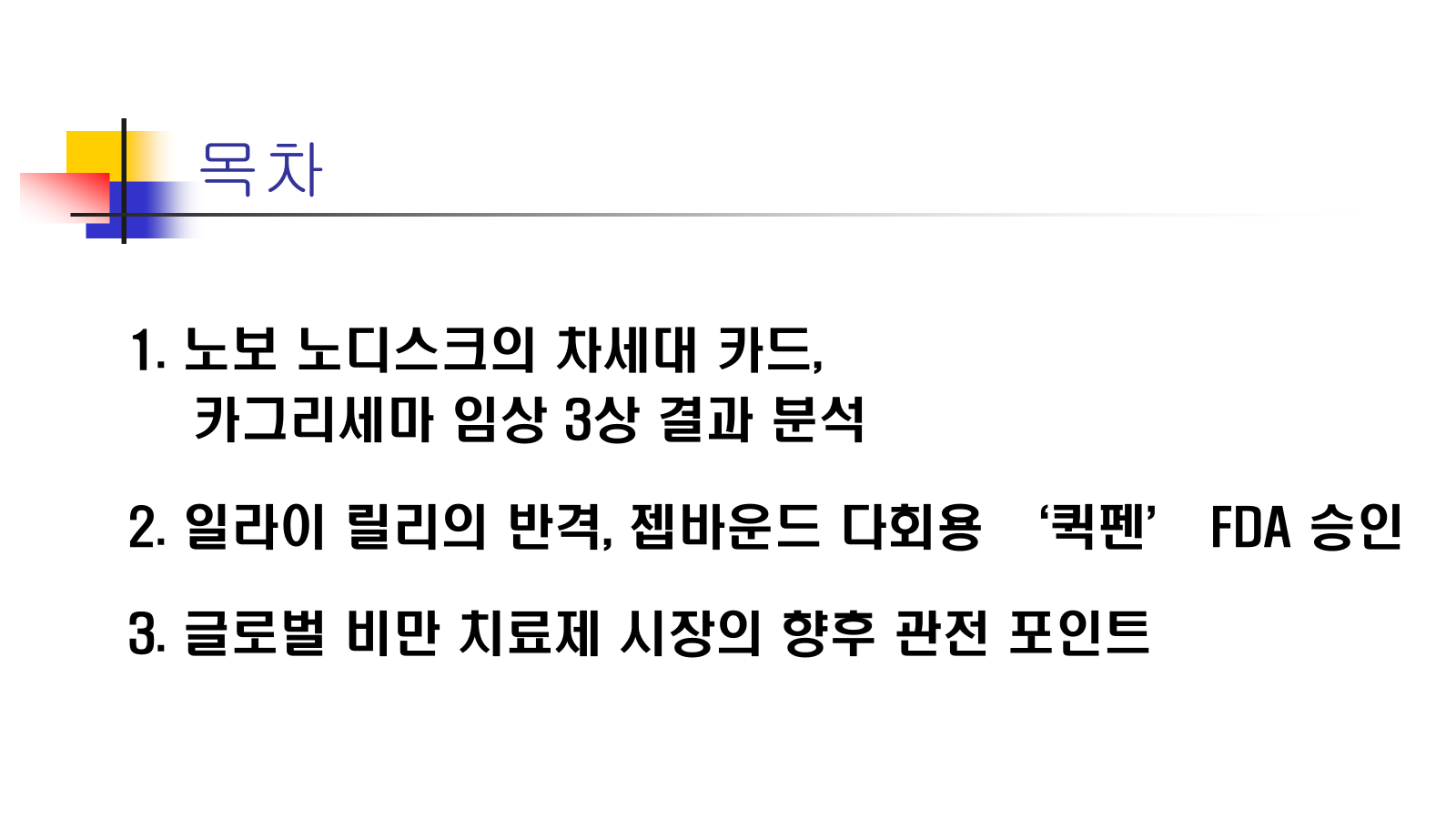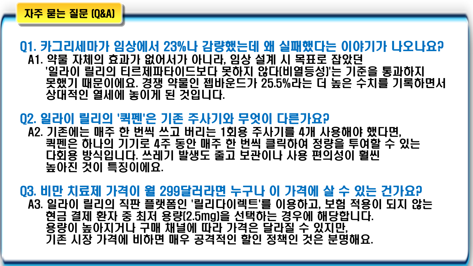 - 후속 단계: 고용량 카그리세마 임상과 REDEFINE 11 임상을 통해 약물의 잠재력을 끝까지 확인하겠다는 계획입니다. FDA 승인 여부는 2026년 말경 결정될 것으로 보여요.