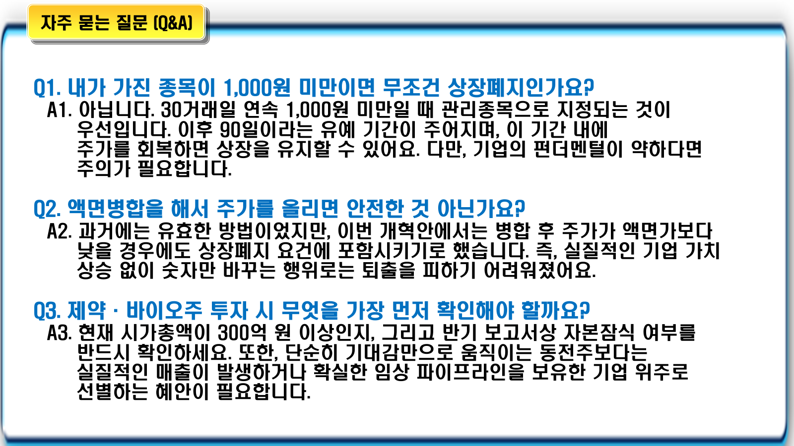 - 단순히 주가를 높이기 위해 액면병합을 단행하더라도, 병합 후 주가가 액면가 미만인 경우에는 상장폐지 요건에 그대로 포함되도록 설계하여 인위적인 수치 조작을 막았습니다.