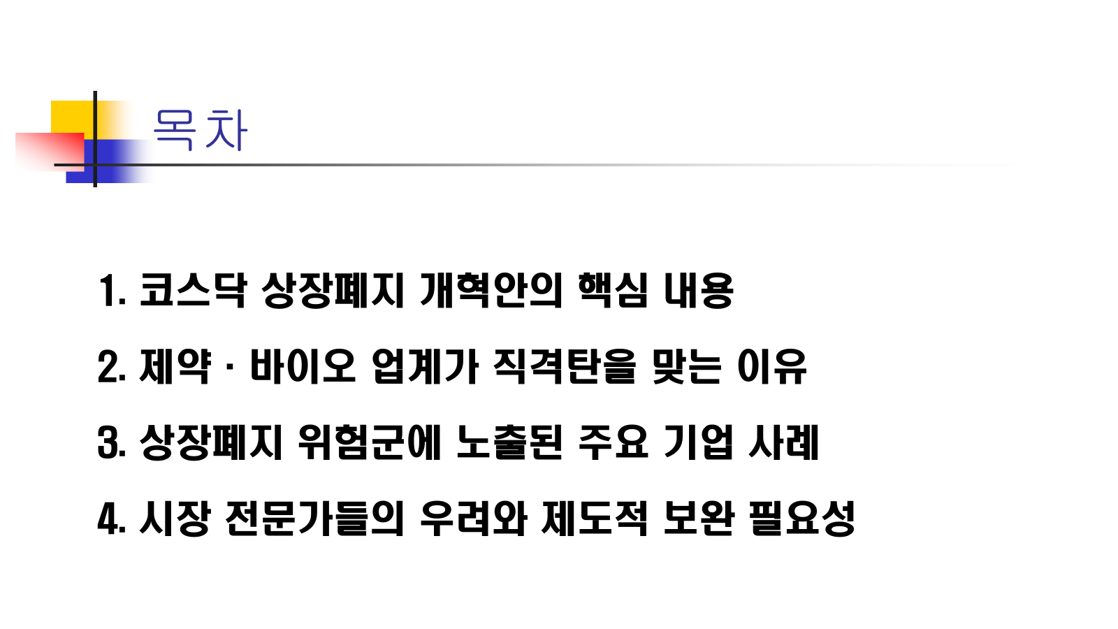 하지만 이번 조치의 유독 큰 영향을 받을 것으로 예상되는 분야가 바로 제약·바이오 섹터입니다. 산업 특성상 장기간의 R&D 투자가 필요하고 당장의 수익성보다는 미래 가치에 의존하는 경향이 크기 때문이죠. 오늘은 정부의 상장폐지 강화 방안의 구체적인 내용과 함께, 이것이 제약·바이오 기업들에게 어떤 현실적인 위협과 기회가 될지 상세히 분석해 보겠습니다.